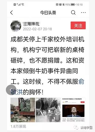 成都关停上千家校外培训机构,机构宁可把崭新的桌椅砸碎,也不愿捐赠。这和资本家倾倒牛奶事件异曲同工。这时候,不得不佩服俞敏洪的胸怀!